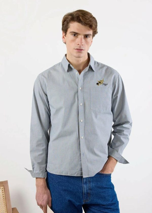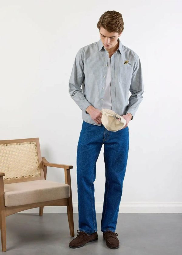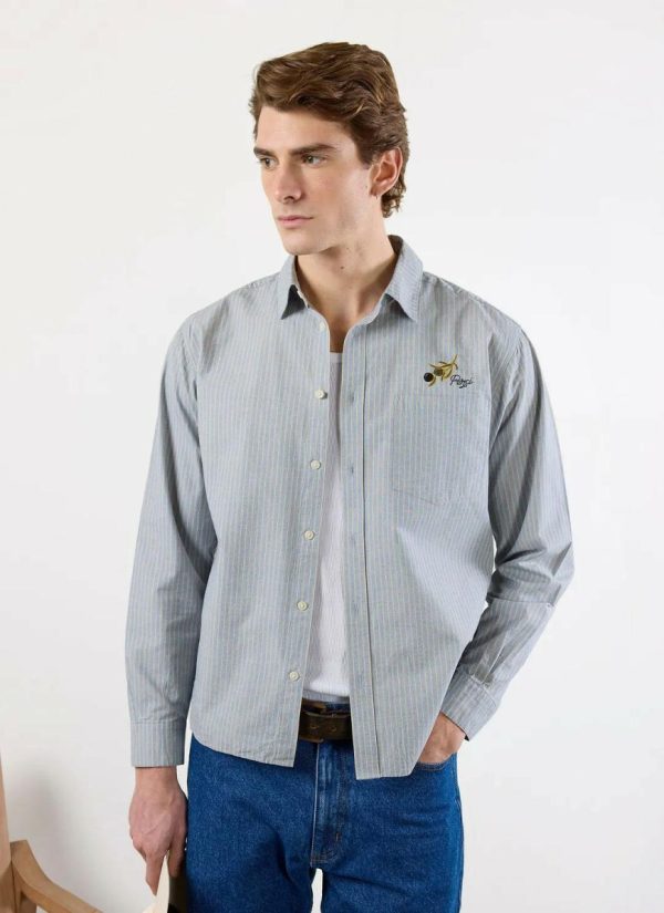 - Features: Men’s striped shirt in an oversized fit. Made from a Japanese fabric and finished with custom embroidery, this blue shirt is ideal for warmer weather and a summer wardrobe staple.
