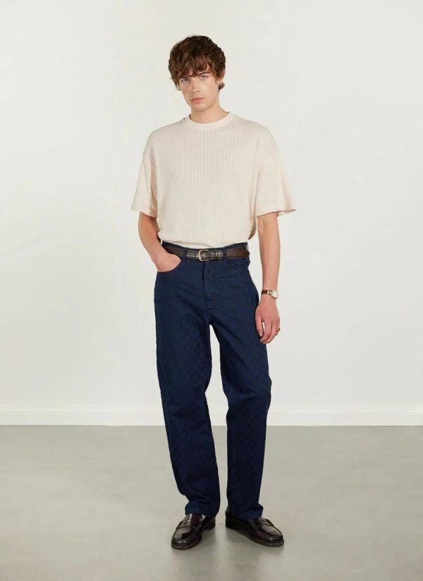 - Features: Men’s checkerboard trousers crafted from premium Japanese denim. Featuring a leather engraved back patch, these straight leg trousers are ideal for everyday wear.