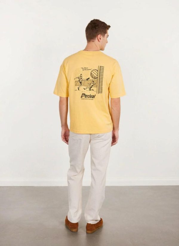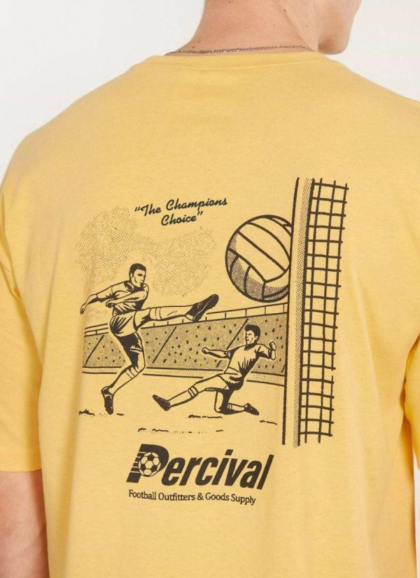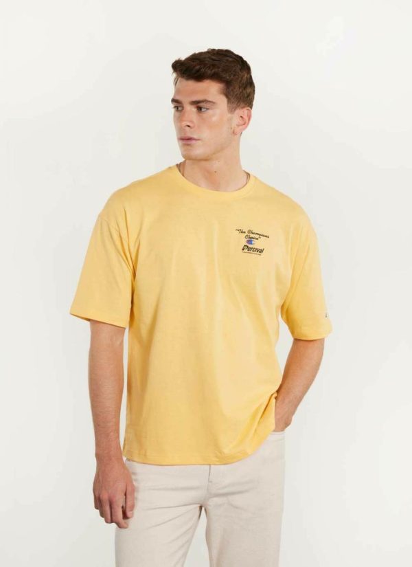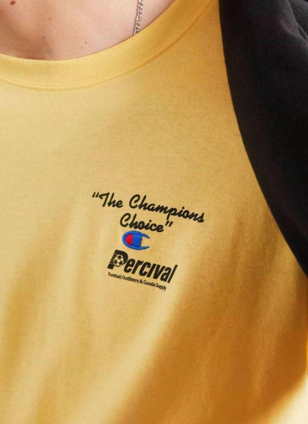 - Features: Men’s short sleeve t shirt with screen print and Champion embroidery. Screen printed by Percival in London on a 180 gsm premium cotton, this mustard champion t shirt is ideal for warm weather and an easy-to-wear staple.