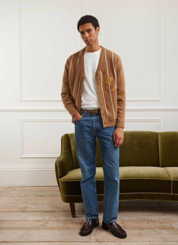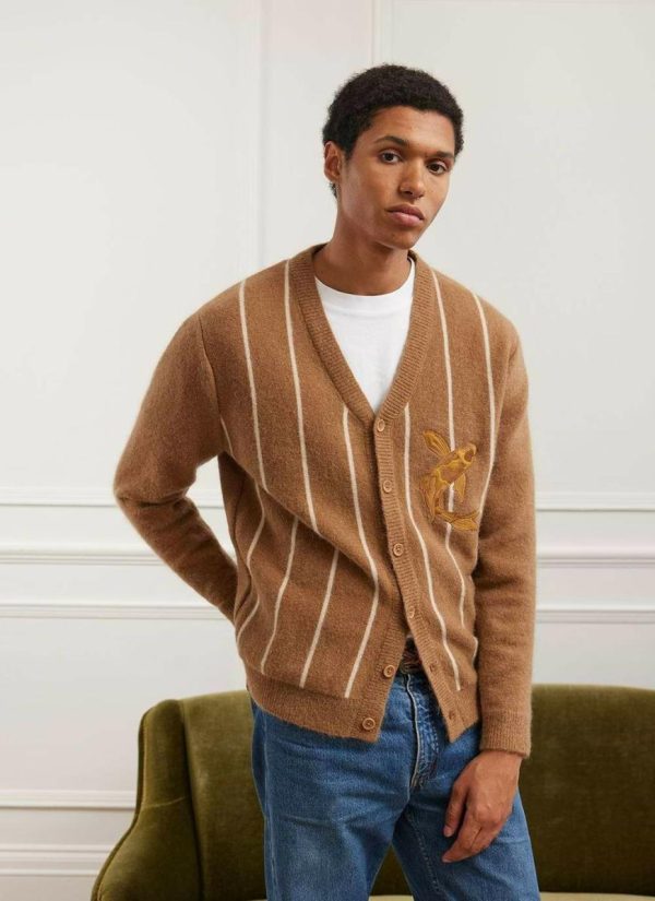 - Features: Men’s knitted cardigan made from a premium mohair & wool blend with a jacquard design. Finished with ann applique embroidered koi on front chest, engraved buttons and rib on cuff, placket and hem