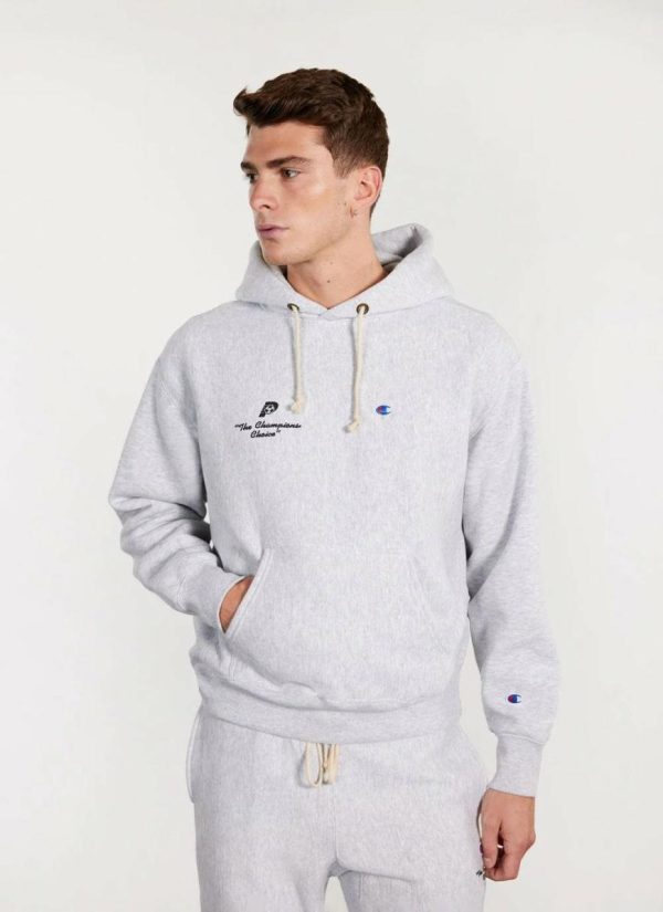 - Features: Men’s heavyweight hoodie with screenprint and Champion embroidery. Screen printed by Percival in London on a 400 gsm reverse weave premium fleece and with a crew neck, this athletic grey champion hoodie is an easy-to-wear wardrobe staple.