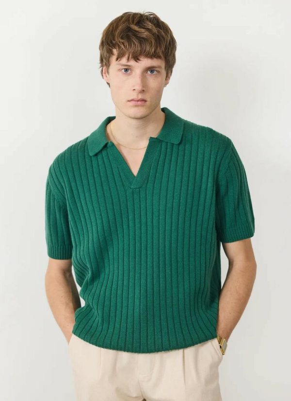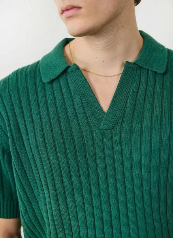 - Features: Men’s ribbed short sleeve polo shirt in forest green. With an open collar, this timeless piece is from the Percival x Ilaria collection and is ideal for wearing during warmer months and on holiday.