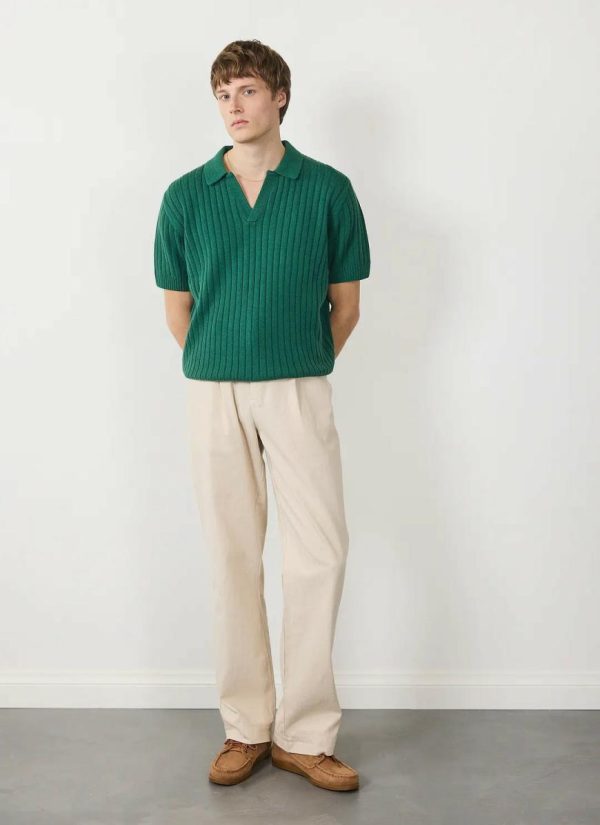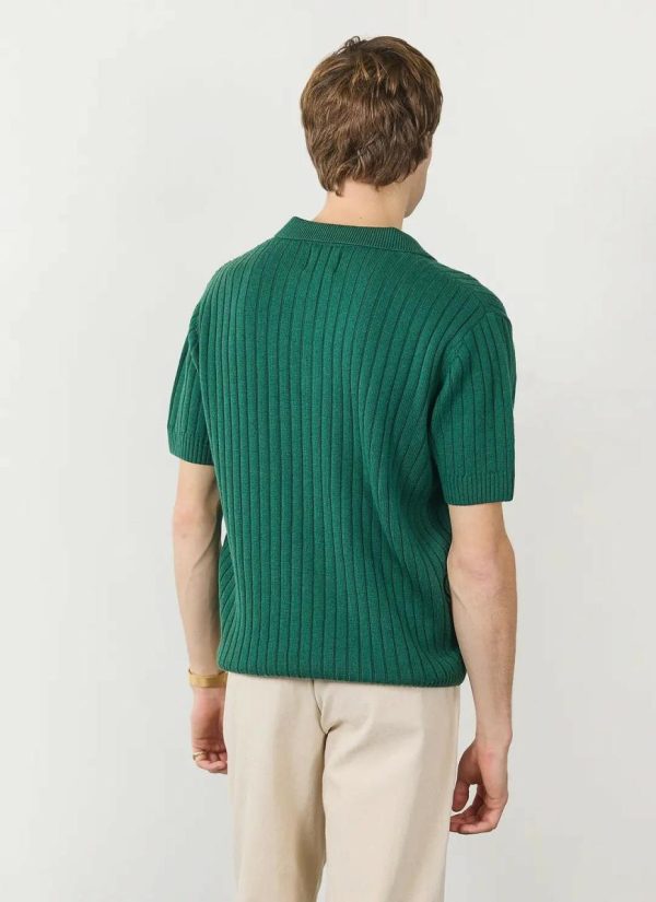 Part of Percival DNA is our knitwear. Where the wit of knit comes together. Open collar ribbed polo, knitted in a machine washable merino wool/cotton blend. The colour of the season, deep rich forest green at an affordable price. Classic fit, slightly cropped, comfortable on the body- wear with pleated trousers and make an entrance.