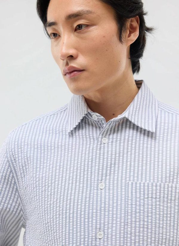 Seersucker, the fabric that the iron can not tame, it needs no steam nor pressing for a crinkled delight to the eye it is. It is a bit of a summer holiday – if you only pack one shirt this is it – type of shirt, a Swiss army shirt, maybe not. Percival versatile summer styles, pair with beach, vespa, resort, paraponting you get the drift.