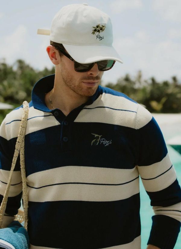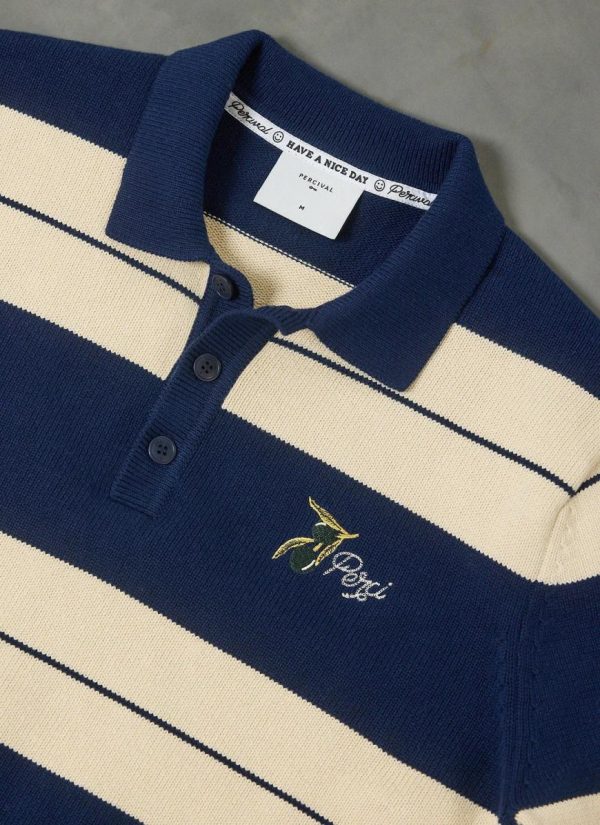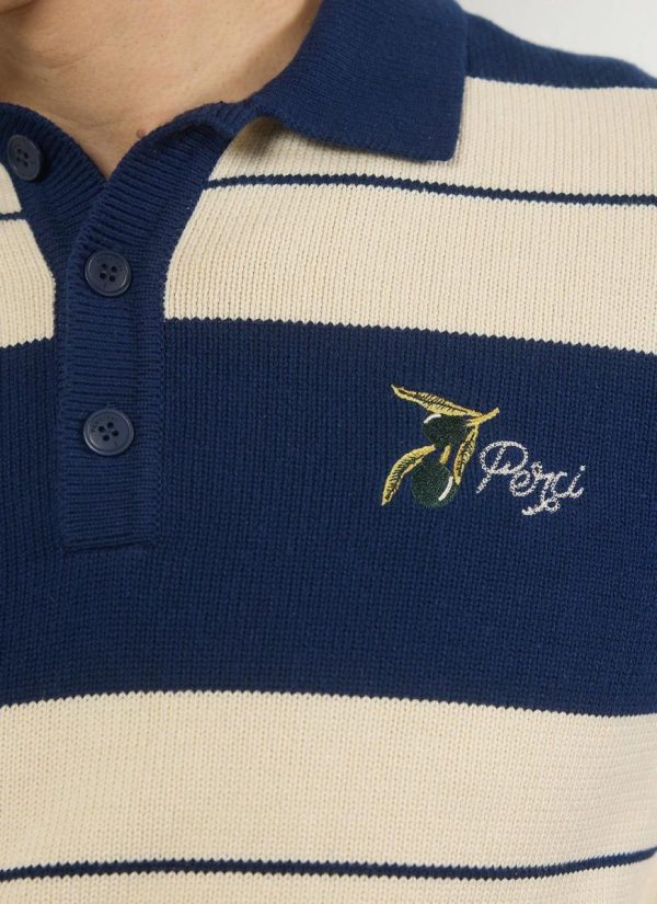 Part of the Percival Spring Summer 2025 collection, striped knit polo. Heavy weight quality cotton knit, vintage but classic, a never out of style, style. Embroidered with hand drawn olives at chest. Percival Spring Summer 2025, inspired by Italian food, people, style. Full flavour, full Perci pomodoro, the sauce of good fits. Add two legs of Percival denim, serve fresh.